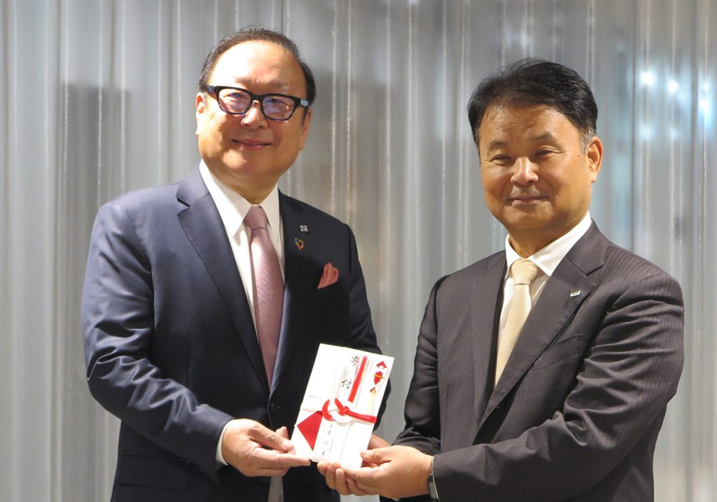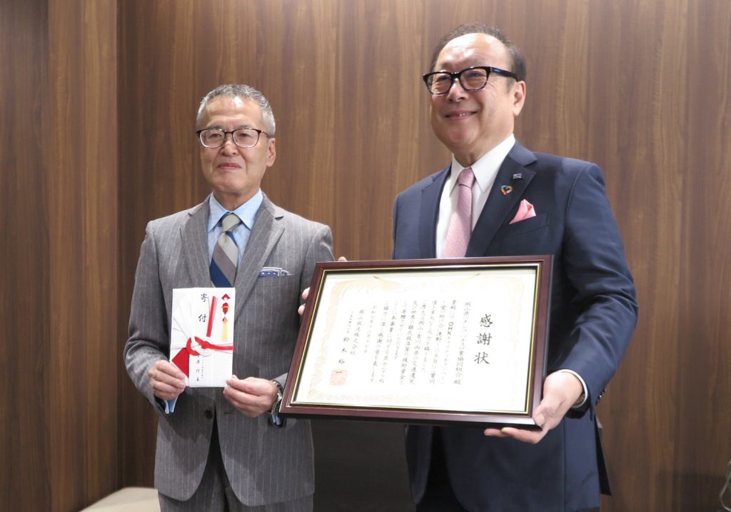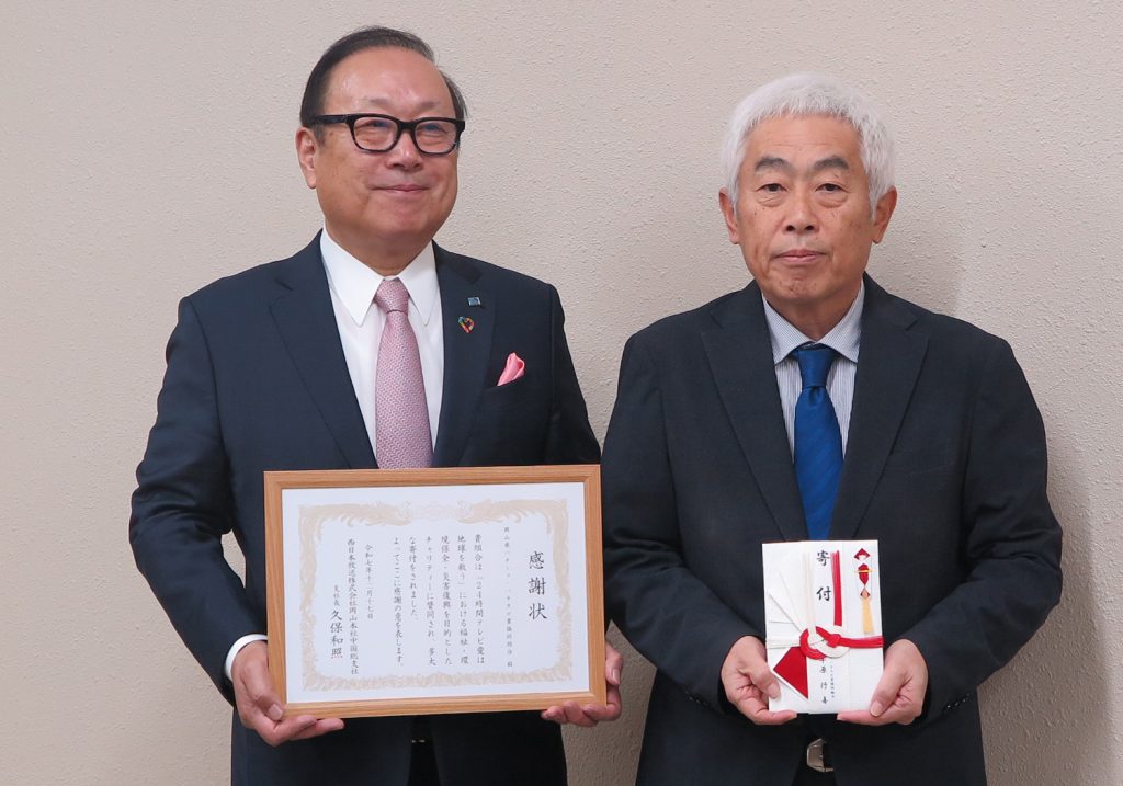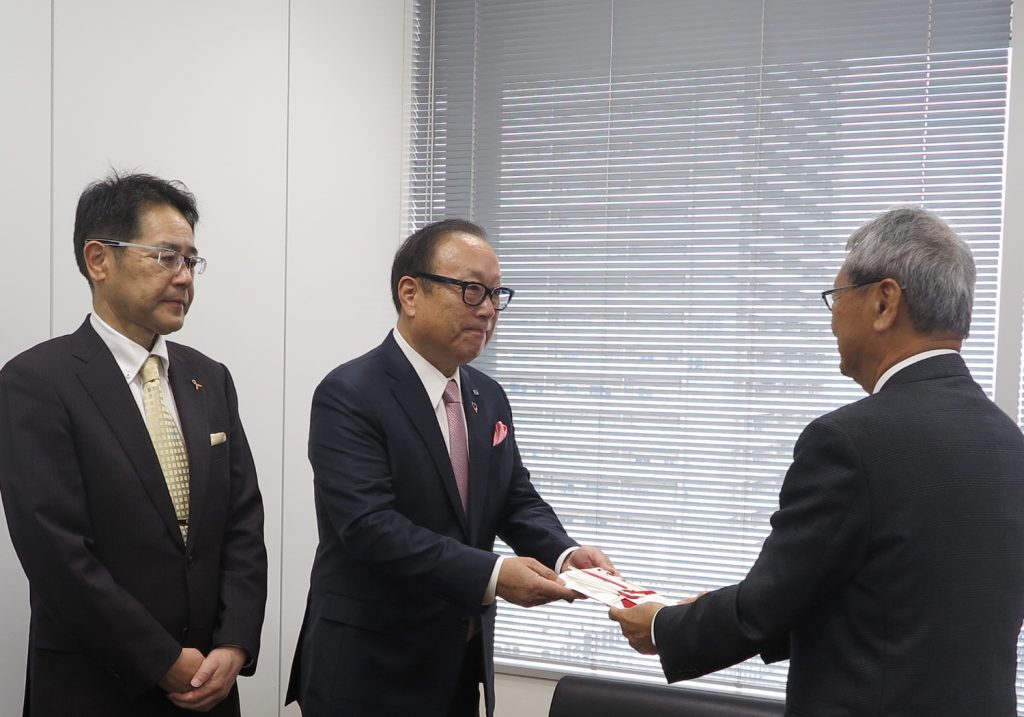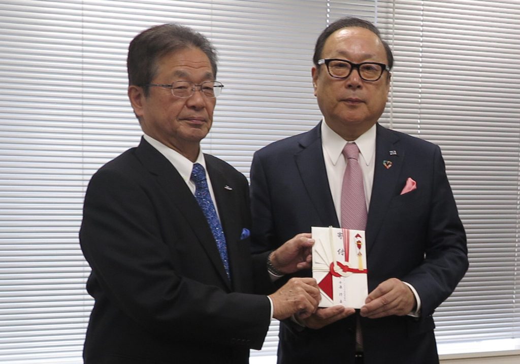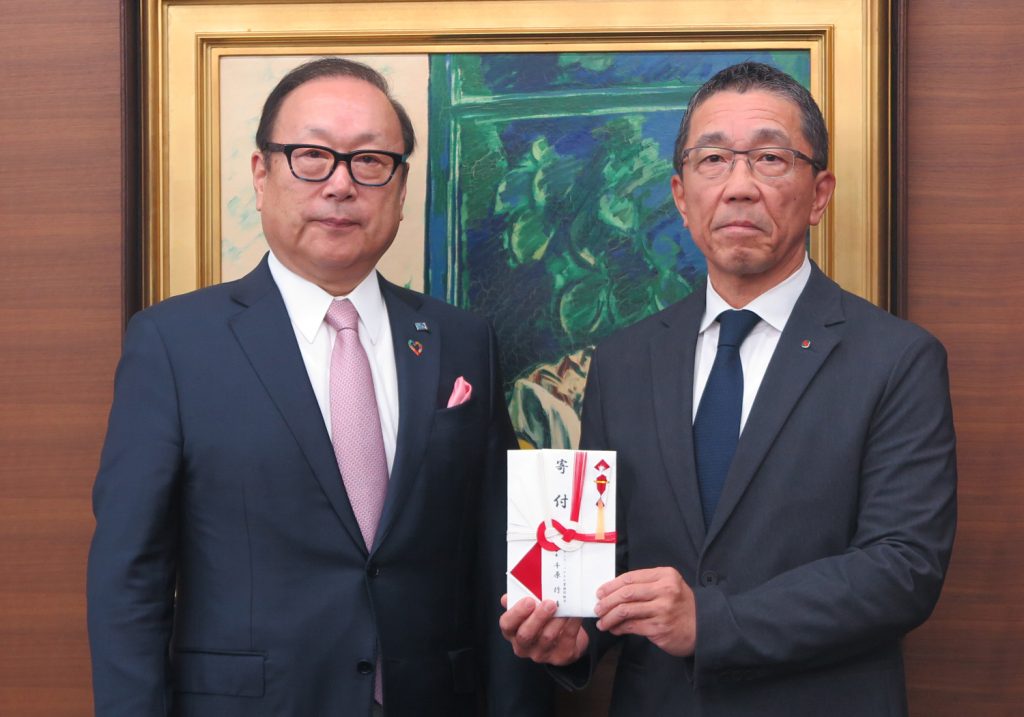 当日は、同組合の千原理事長、三澤専務理事が各報道機関を訪問。今回は、山陽新聞社会事業団(50万円)、テレビせとうち(25万円)、岡山放送(25万円)、瀬戸内海放送(25万円)、西日本放送(25万円)、山陽放送(25万円)の寄付金を贈呈いたしました。